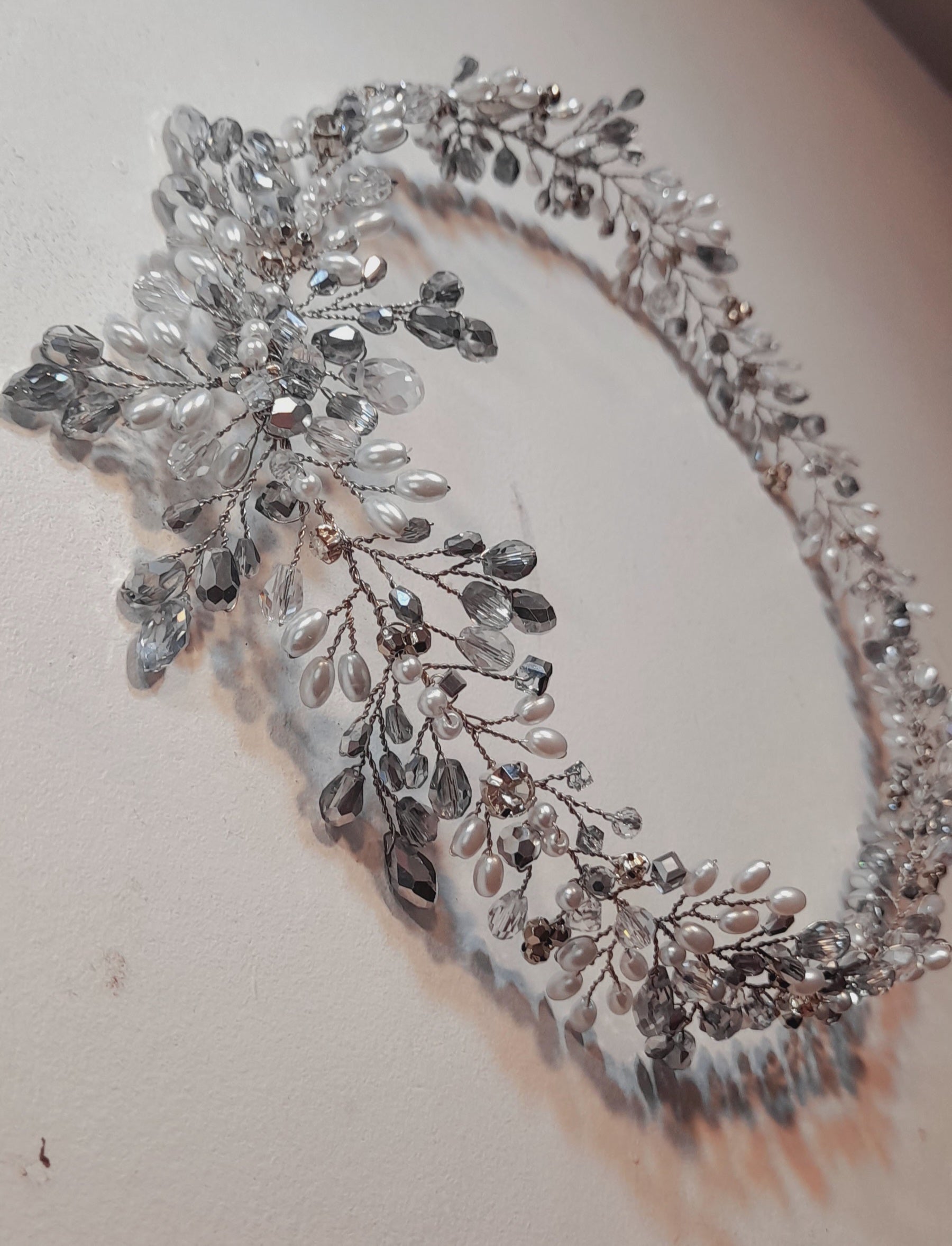 Corona de cristales en color plateado y transparente, perlas blancas y detalles de strass.
