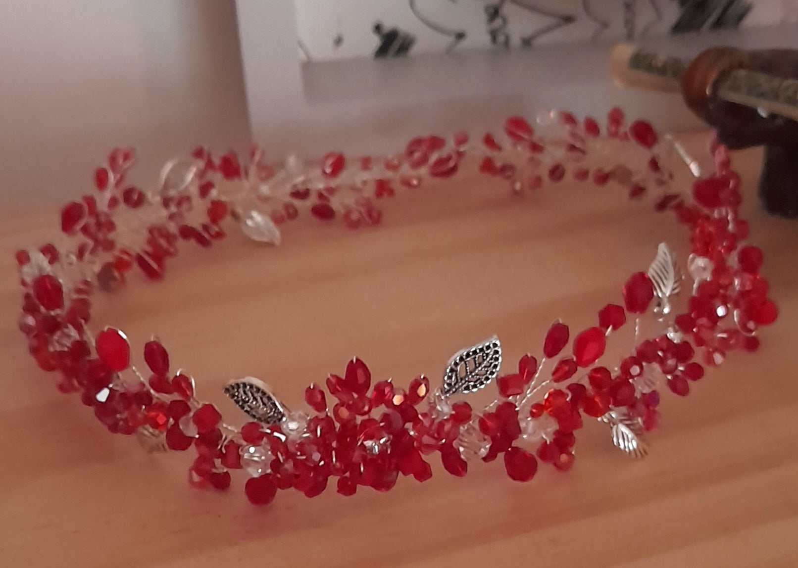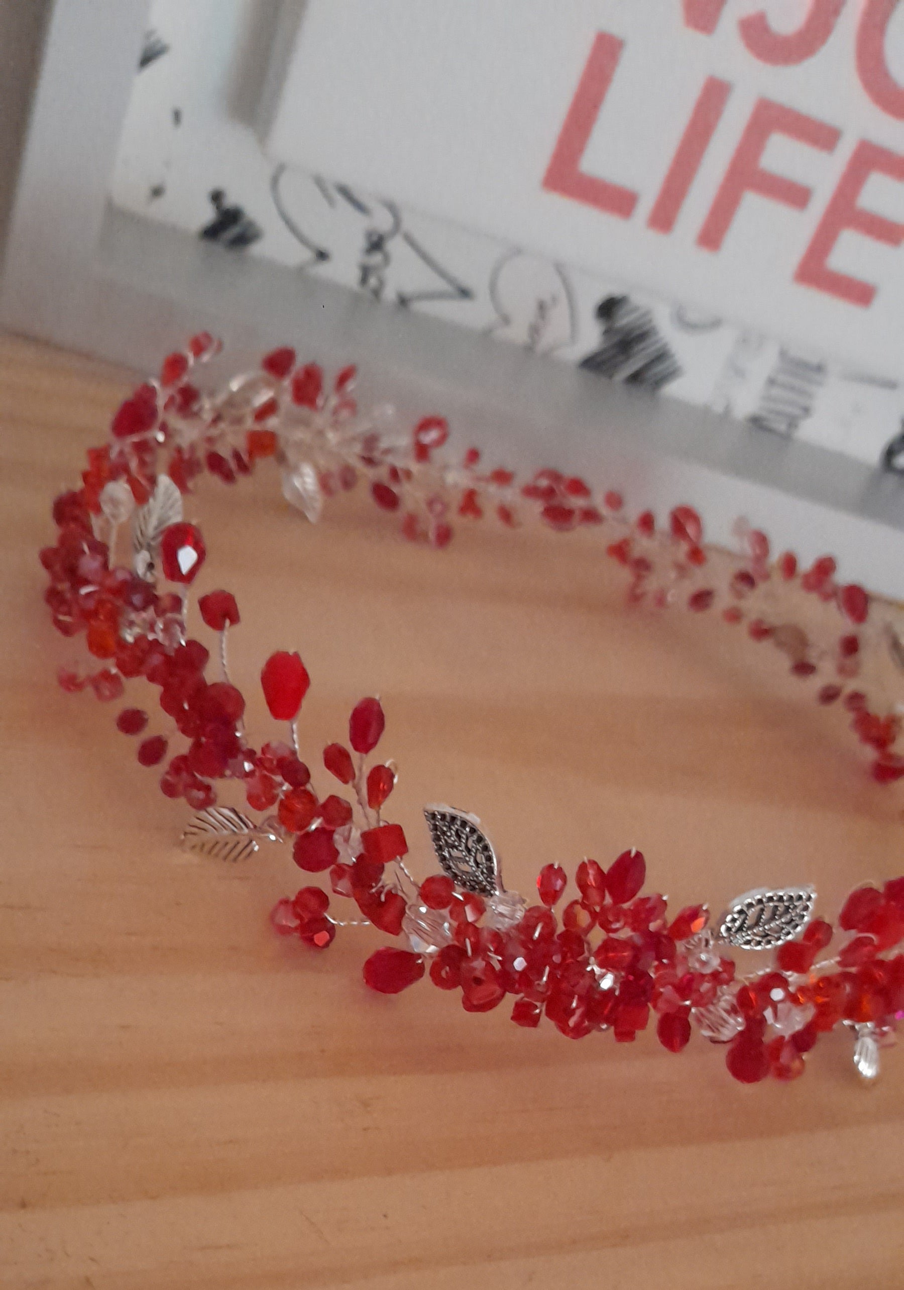 Corona de cristales en tonos rojos y transparentes, hojas plateadas y detalles de strass.