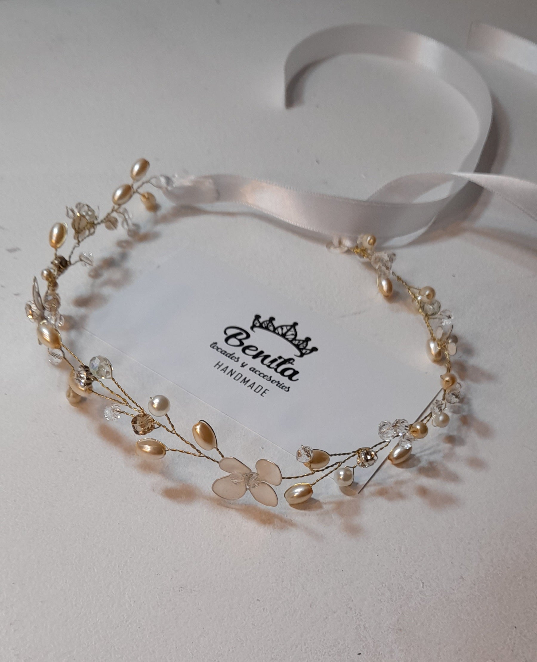 Tiara de cristales en champagne y transparente. Perlas color natural y blanco más detalles de strass y flores nacaradas.