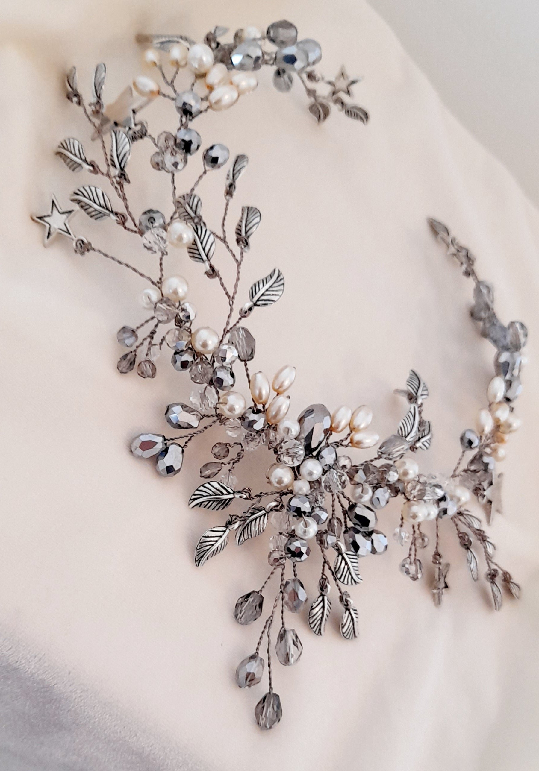 Tocado de cristales plateados transparentes y humo .Hojitas plateadas y perlas color natural y champagne con detalles de strass.